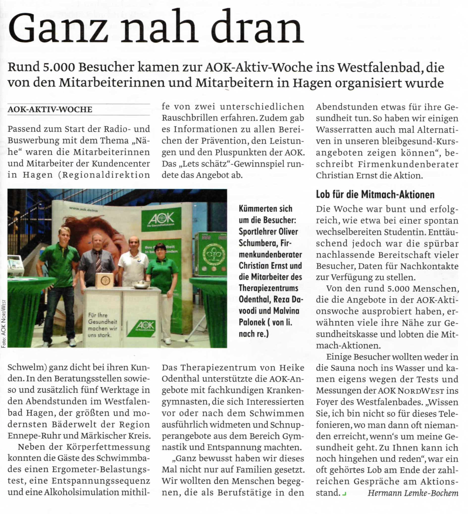 Rund 5.000 Besucher kamen zur AOK-Aktiv-Woche ins Westfalenbad. Dabei kümmerten sich u.a. auch die Mitarbeiter des Therapiezentrums Lennetal von Heike Odenthal um die Besucher und unterstützen die AOK-Angebote mit fachkundigen Krankengymnasten, die Schnupperangebote aus dem Bereich Gymnastik und Entspannung durchführten.
